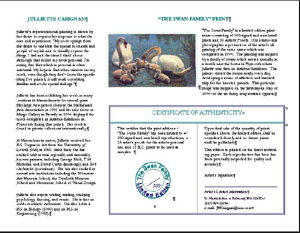 For dealers: I will provide a downloadable dealer kit for new dealers who would like to buy or consign existing "Swan Family" prints. This kit which provides all the documents needed to contract with me and order the prints, as well as Tear Sheets for advertising and sample certificates of authenticity.